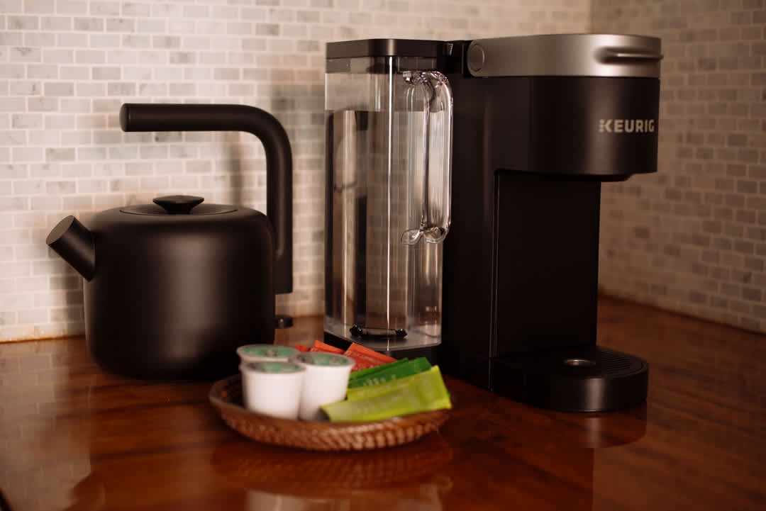 Baking sheet, Blender, Coffee, Coffee maker, Cookware, Dining table, Dishes and silverware, Freezer, Kettle, Microwave, Oven, Refrigerator, Stove, & Wine glasses