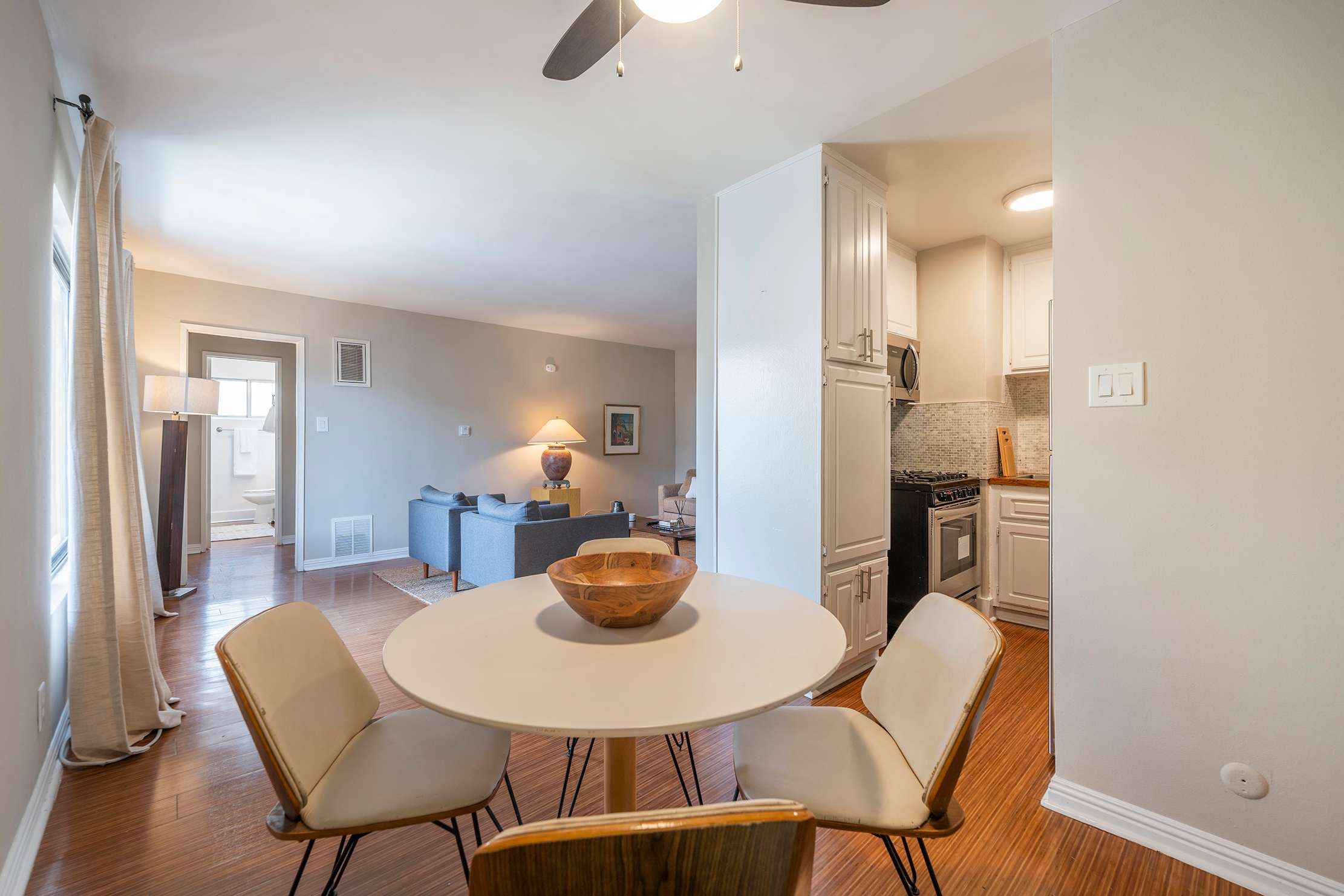 Welcome to your private retreat in the heart of Los Angeles—simple, comfortable, and fully equipped with the essentials for an easy stay. The unit features a king-size bed with soft cotton bedding, a sofa bed for extra guests, and a living area with two lounge chairs and a dining table for four. The kitchen includes all the basics, such as a coffee maker, microwave, fridge, cookware, and utensils. Unwind in the bathroom with a tub, shower, and fresh cotton towels, or relax with your favorite shows on the Roku TV. Stay comfortable year-round with window A/C, and take advantage of the small office space with a desk, Herman Miller chair, and storage cabinet. Building amenities include an outdoor pool and an on-site laundry room for added convenience.