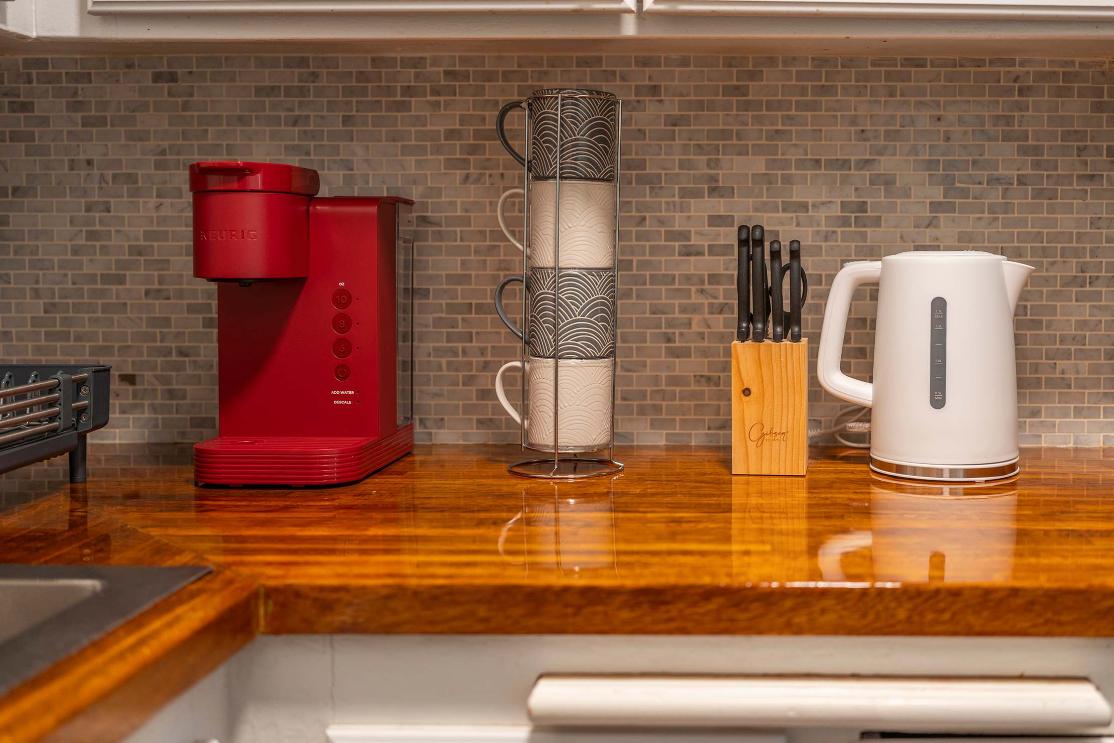 Coffee maker, Cookware, Dining table, Dishes and silverware, Oven, & Refrigerator