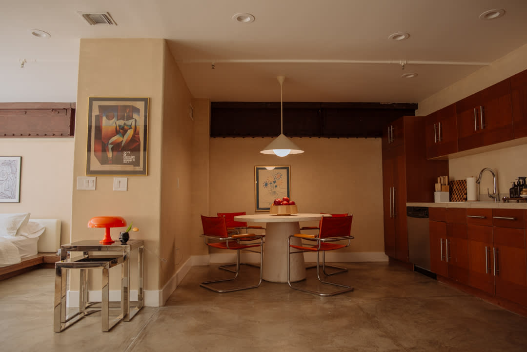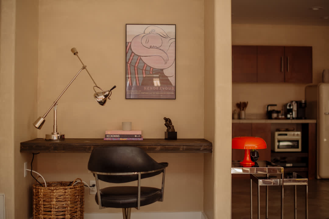 The loft is a desirable living space on the second floor of a corner building, with a mid-century modern aesthetic. The layout provides ample space for work, cooking, and leisure. The open-plan design enhances the sense of space. The living area has large skylight windows for natural light and views (note: there are no widows in the loft, but the skylights can be opened for fresh air to enter!). The king-size bed offers a comfortable sleep. The unit provides a functional workspace and a pleasant environment for both work and leisure.