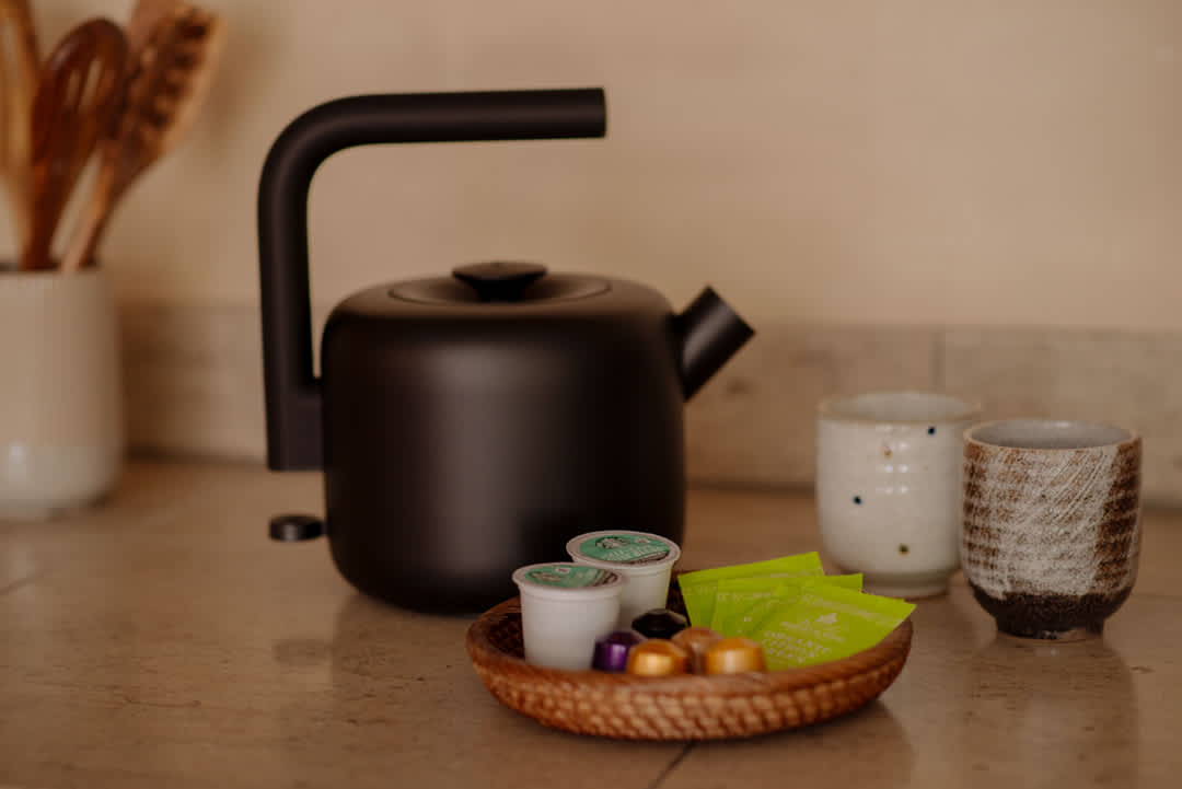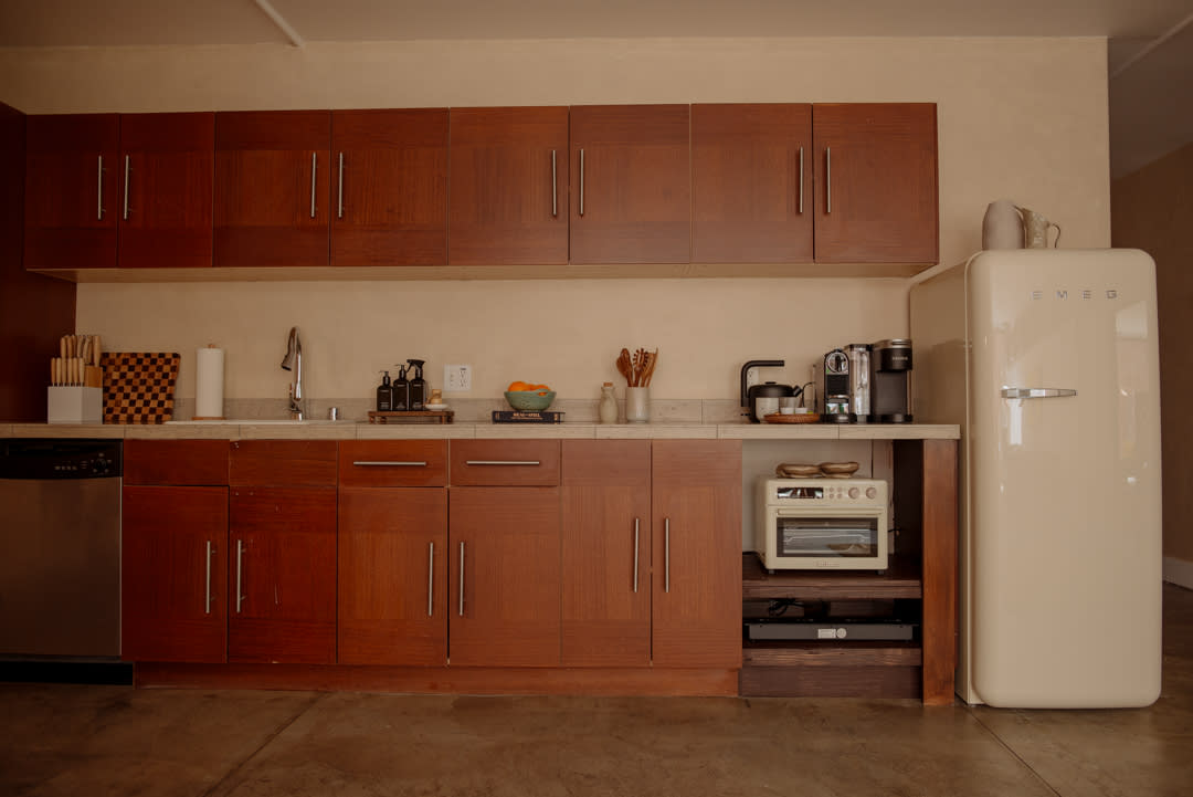 Baking sheet, Blender, Coffee, Coffee maker, Cookware, Dining table, Dishes and silverware, Dishwasher, Freezer, Kettle, Microwave, Oven, Refrigerator, Stove, Toaster, & Wine glasses